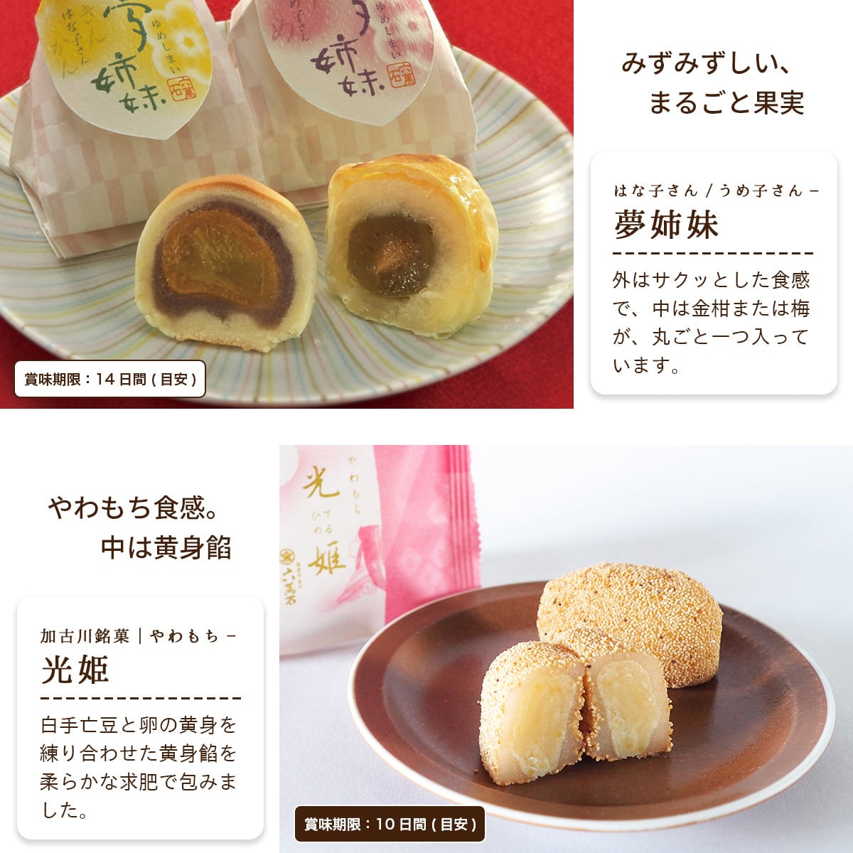 内容量 六萬石最中:2個、播磨にて:1個、あいまこいま:2個、月の輪ミルク:1個、生醤油ぱい:1個、夢姉妹:2個、光姫:1個、藤の花:1個、和三盆糖:3個