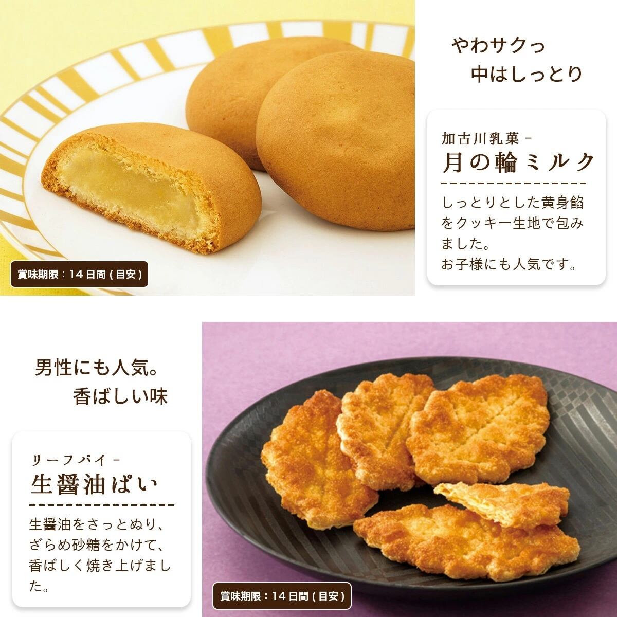 内容量 六萬石最中:8個、播磨にて:2個、あいまこいま:2個、播磨もよう:4個、加古まろん:4個、月の輪ミルク:1個、生醤油ぱい:1個、夢姉妹:4個、光姫:1個、藤の花:1個