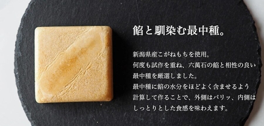 最中は、餡が注目されがちですが、餡と皮の相性がとても重要です。色々と試行錯誤し、絶妙に馴染み合った六萬石最中に仕上がりました。