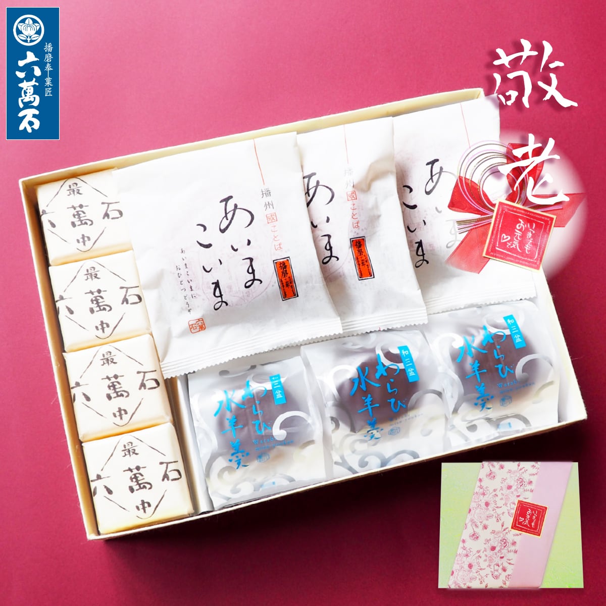 内容量	六萬石最中 4個、わらび水羊羹 3個、あいまこいま 3個